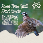 The South Texas Quail Short Course has reached full capacity and is now sold out. If you would like to be added to the waiting list should a spot open up, please email gina.cavazos@tamuk.edu.